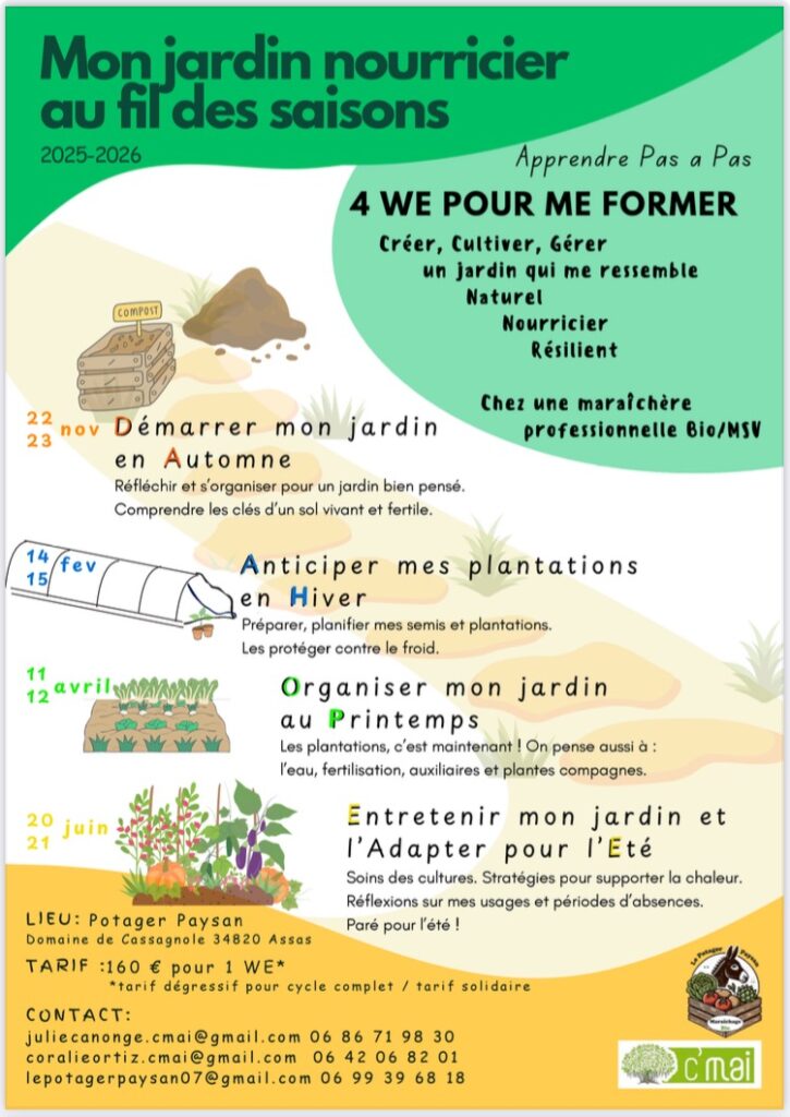 Nous vous proposons également une formation : « comment créer et gérer son jardin nourricier au fil des saisons ». Apprentissages théoriques et pratiques dans un cadre bienveillant et ludique. Une reconnexion à la nature salutaire dans nos vies bien remplis 🙂